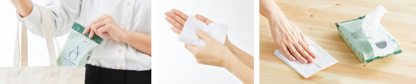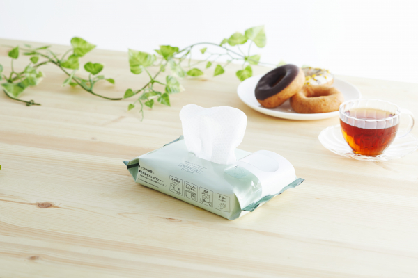 外出先での手指の汚れの拭き取りや、共用物に触れる際にサッと取り出すことができる携帯用と、お食事前のテーブルや、オフィスの会議室など、広い範囲を1枚でたっぷり拭ける大判サイズを用意。用途に合わせてお選びいただける、充実のラインアップです。
