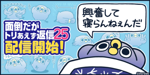 株式会社インクルーズ(東京都渋谷区、代表取締役社長 山﨑 健司)は、LINE株式会社(東京都新宿区、代表取締役社長 出澤 剛)が運営するコミュニケーションアプリ「LINE」内のスタンプショップにて、「面倒だがトリあえず返信25」を2021年3月25日(木)に配信致しました。