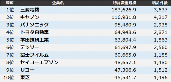 株式会社パテント・リザルトは4月1日、全業種の企業を対象に、各社が保有する特許資産を質と量の両面から総合評価した「全業種 特許資産規模ランキング2020」をまとめました。2019年4月1日から2020年3月末までの1年間に日本特許庁が登録した特許を対象に、個別特許の注目度を得点化する「パテントスコア」を用いた評価を行い、企業ごとに総合得点を集計しました。
