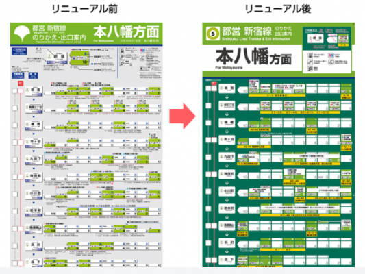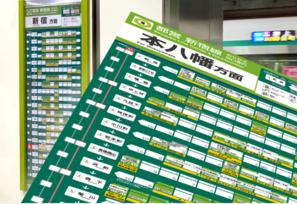 今回リニューアルされるのは、都営地下鉄新宿線、大江戸線の全駅に掲出されているのりかえ便利マップです。