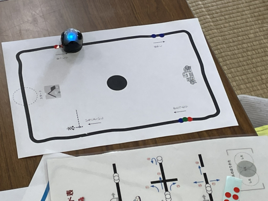 アメリカ生まれのプログラミング用教育ロボットOzobot(オゾボット)を使って、プログラミング学習を実施しました。このロボットは色ごとに指定された指示にしたがって進むロボットで、今回の体験では、ワークシートと市販されている丸型のカラーシールを使い、様々な色のシールをワークシートの上に張り、オゾボットの機能と動きを学ぶ体験をしました。