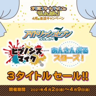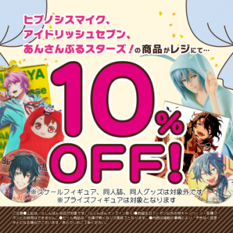2021年4月2日(金)~4月9日(金)の期間中、『ヒプノシスマイク』『アイドリッシュセブン』『あんさんぶるスターズ!』の関連商品が10%OFFになるセールを実施いたします。