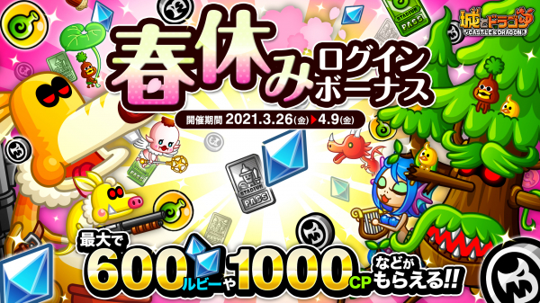 3月26日(金)より、最大で600ルビーや1000CPなどがもらえる「春休みログインボーナス」を開催いたします。