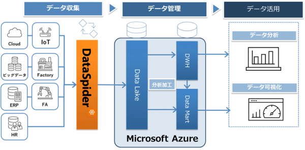 NSWは、2017年よりIoT/データ分析領域において日本マイクロソフトとの連携を開始し、同社のクラウドプラットフォーム「Microsoft Azure」を活用したサービス提供を行ってきました。この経験で培ったノウハウを活かし、Microsoft Azure上に存在するデータを統合管理するため、DataSpider を活用しMicrosoft Azure上への導入支援、設計開発支援、運用設計を提供します。また集約したデータの分析・可視化・業務活用する基盤を一気通貫でご提供することも可能で、情報の収集から活用までお客様のDX実現を支援します。