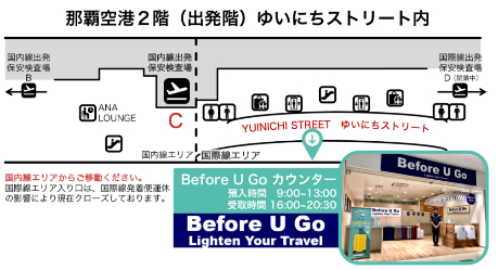旅行者は、那覇空港内の全日空商事が運営する店舗「Before U GO(呼称:ビフォーユーゴー)」で手荷物を預けることで、ホテルへのチェックイン時間まで手ぶらで飲食や観光を楽しむことが出来ます。またホテルのチェックアウト時にも当サービスを利用することで手荷物を空港で受け取ることが出来るため、旅行最終日の観光やショッピングなどにも時間を最大限活用することが出来ます。