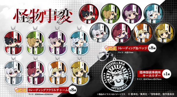 TVアニメ『怪物事変』より、「ひょこっとトレーディングアクリルチャーム」「ひょこっとトレーディング缶バッジ」「隠神探偵事務所キーホルダー」の3商品の発売が決定いたしました!