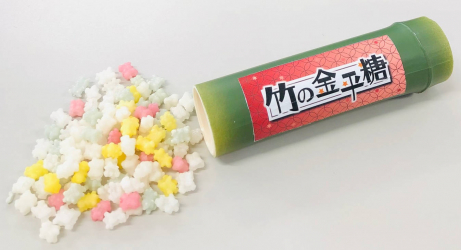 「竹の金平糖」は竹筒型の容器に金平糖が入っています。食べ終わった容器は紐を通すことが出来るので人気キャラクターのコスプレに使用することも出来ます。