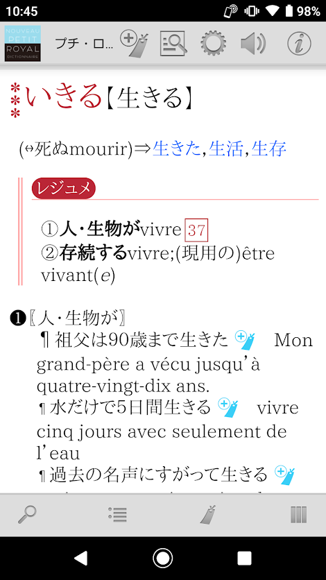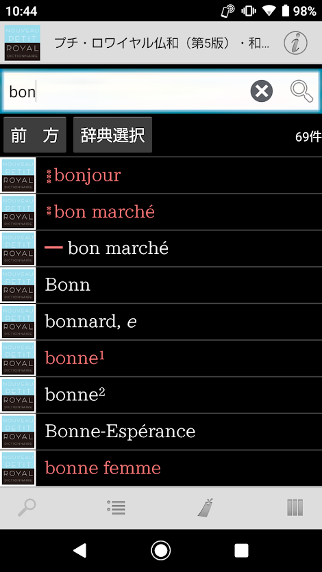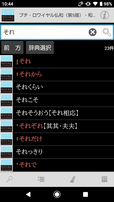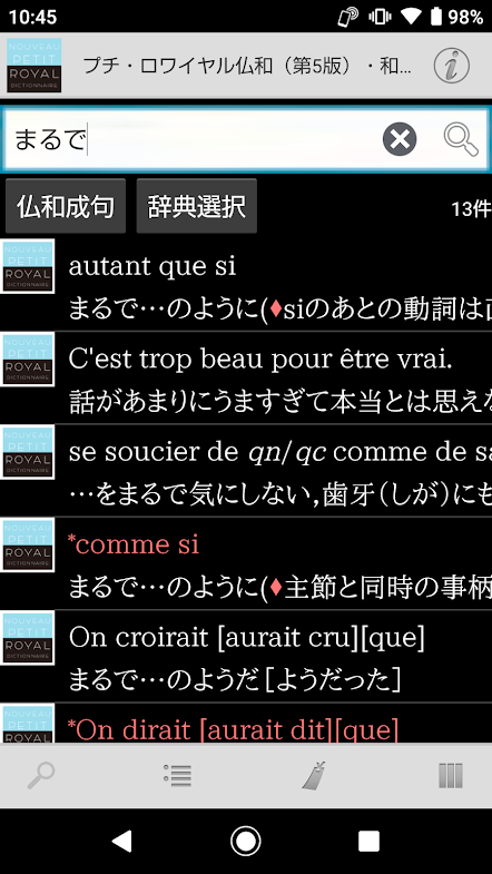 ・仏和項目、和仏項目をまとめて検索するので、日本語からでもフランス語からでも素早く検索できます。