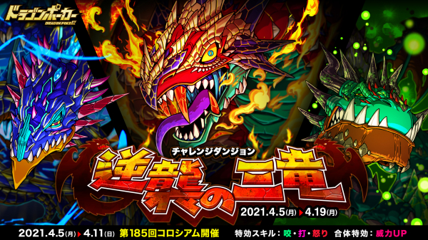 株式会社アソビズム(本社:東京都千代田区、代表取締役:大手智之)は、App Store・Google Playにて好評配信中のリアルタイム合体カードバトル『ドラゴンポーカー』で、2021年4月5日(月)より復刻チャレンジダンジョン「逆襲の三竜」を開催いたします。