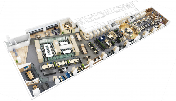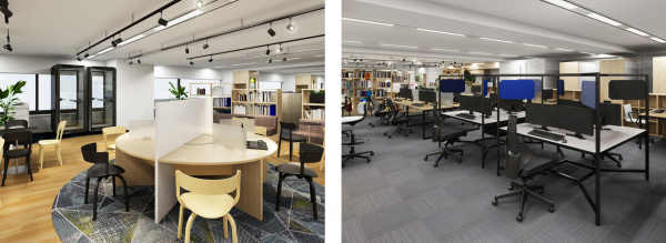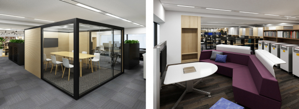今回のリニューアルではオフィスワークとテレワークの併用を前提に、ポストコロナ時代の新しいオフィスや働き方に求められる要素や機能、座席形態などを最適化し、「求心力」のあるオフィスを具現化しています。