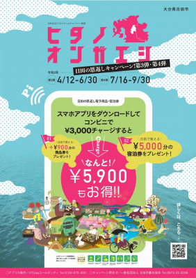 ・電子商品券「ひたpay」を活用して、全国コンビニエンスストアでひたpayアプリに3,000円をチャージすると電子商品券900円(プレミアム率30%)+電子宿泊券5,000円が付与されます。
