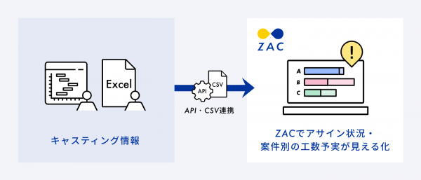 これまでは1案件ずつZACの画面上からキャスティング情報を入力・更新する必要がありましたが、本機能をご利用いただくことで入力・更新の手間が大幅に削減されます。システム操作の事務作業を減らして案件業務や高度なマネジメント業務に使える時間が増えること、またデータの登録・更新の頻度や精度が高まることで、ユーザー様がより高度な案件別原価管理や月別・社員別の稼働管理(リソース管理)を実現できることが期待されます。