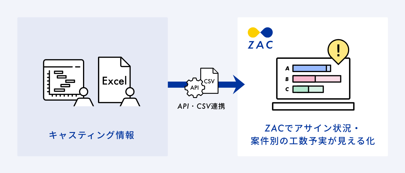 キャスティング取込は、API経由またはCSV取込で、複数案件・複数名・複数月の稼働予定時間(キャスティング)を一括でZACに登録・更新するための機能です。