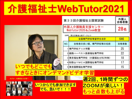 上記合格者が受講した2020年度の講座は、通年のオンデマンドビデオ講義に、期中より任意参加のZOOMフォローアップが追加されていました。今年度(2021年度)は、オンデマンドビデオ講義とZOOMフォローアップ授業を受講必須とする形式に改め、教育効果をさらに高めています。受講料は翌年受験日まで一律、特定技能外国人が無料、その他外国人1万円、日本人2万円と低額に設定し、外国人でも受講しやすくしてします。(4月5日時点での受講生は日本人も含めて100名)本講座の概要については次のホームページを参照ください。
