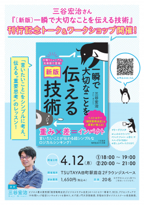 『〔新版〕一瞬で大切なことを伝える技術』(知的生きかた文庫/三笠書房)の刊行を記念して、著者の三谷宏治さんによる刊行記念トーク&ワークショップが開催されます!