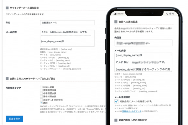 ミーティングの〇〇日前、〇〇時間前になると、ミーティングに参加する会員(+講師)に対してリマインダーを自動で送信。