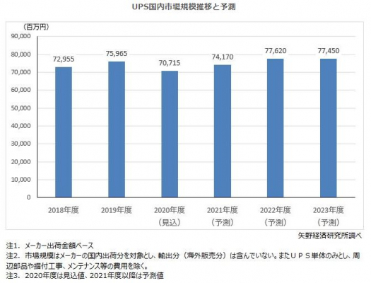 UPS国内市場規模(メーカー出荷金額ベース)は、2019年度に前年度比104.1%の759億6,500万円と拡大したものの、新型コロナウイルスの影響もあって2020年度は707億1,500万円(同93.1%)と縮小する見込みである。
