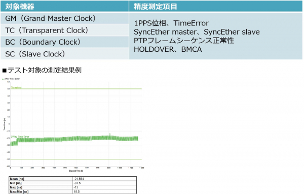 ・ITU-T標準規格、G.8260/G.8261/G.8262/G.8272などに準拠した測定器による各機器の時刻精度/確度を測定