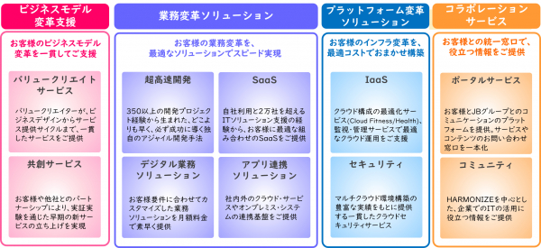 JBグループは、中堅中小企業の「DXをどう進めればよいか一緒に考えてほしい」「セキュリティを守りつつ運用や保守の負担を軽減したい」「ビジネス変革へのステップとして柔軟なクラウドシステム基盤を構築したい」等の期待に応え、「HARMONIZE」を通じて、将来に渡るDXパートナーとしてシステムのライフサイクルやお客様の事業の拡張・発展に合わせたDXの実現を継続して支援します。「HARMONIZE」はJBグループ各社が連携し、総力を挙げて各サービスを提供・販売します。