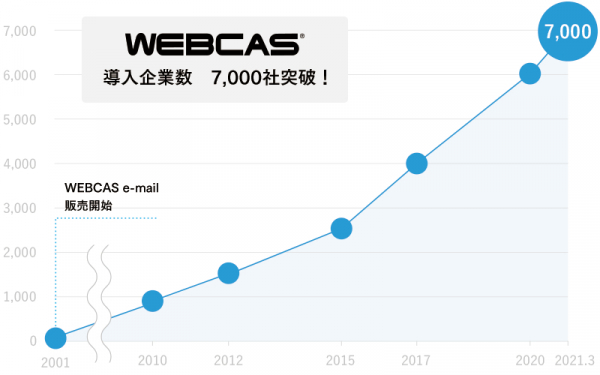 エイジアの自社開発製品である「WEBCAS」シリーズは、企業とお客様の双方向コミュニケーションを、メールやLINE、Webアンケート等で実現できるシステムです。大手EC運営企業、メーカー、情報通信業、生命保険会社、金融機関、官公庁など多様な業界に導入いただいており、このたび導入企業・団体数が7,000社を突破いたしました。
