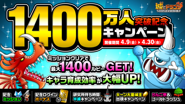 つきましては感謝の気持ちを込めまして、最大1400ルビーがGETできる特別な「記念ミッション」をはじめ、合計1400CPや“ドラゴンメダル”140枚などがもらえる「記念ログインボーナス」、キャラの育成効率が大幅UPする「記念育成キャンペーン」などを開催!