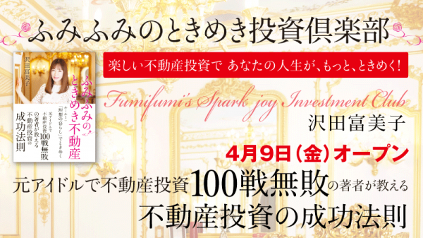 「ふみふみのときめき投資倶楽部」では、ワンルーム投資から始め、赤坂、銀座、麻布など都内一等地に複数の商業ビルを所有するに至った沢田さんの投資成功法が学べるほか、選りすぐりの物件からさらに沢田さんがセレクトした物件を購入できるチャンスもある画期的なサービスです。