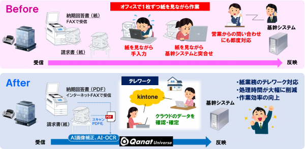 JBグループ業務センターでは、取引先からの紙の請求書や、FAXでやりとりしていた納期回答書をPDF化し、様々な製品やサービスをつなぐクラウドプラットフォーム「Qanat Universe」に取り込みます。手書き文字の筆跡や形を学習して文字認識精度を向上させるAI-OCRに加え、AIによる画像補正機能を組み合わせることで、これまでOCRで自動読み取りができなかったFAXの読み取り精度を98%に高めました。また、AIがあらかじめ学習した画像パターンに従い、OCRで読み取ったデータを自動仕分けしてクラウドのアプリケーション(kintone)に繋ぐ等、人手を介さない自動処理によりテレワークでの業務遂行を実現しました。毎月900件の請求書の処理を自動化する他、手書きの納期回答書への対応も可能にしています。