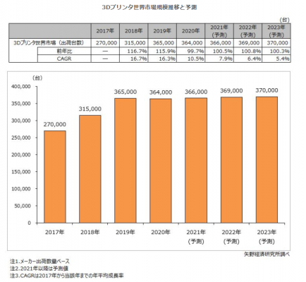 こうしたなか、3Dプリンタ世界市場規模(メーカー出荷数量ベース)の2017年から2023年までの年平均成長率(CAGR)は5.4%で推移し、2023年には37万台になると予測する。