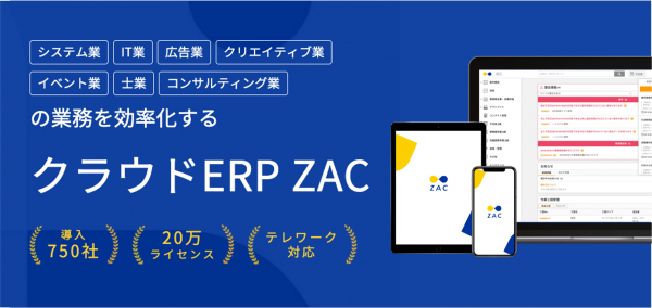『クラウドERP ZAC』は損益管理、プロジェクト管理、管理会計、内部統制、決算早期化を実現する統合型の基幹業務システムです。ITサービス業、広告・クリエイティブ業、コンサルティング業をはじめとした知的サービス業を中心に750社を超える企業様に導入いただいています。