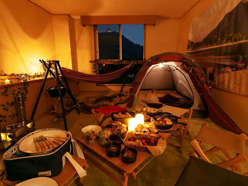 金華山や岐阜城、長良川の景色を眺められ、居間と寝室が分かれているスイートルームを使用。居間にテント、寝袋、ハンモックといったキャンプ用品をご用意。