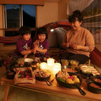 夕食は飛騨牛のビーフシチュー、ミックスピザ、奥美濃古地鶏と美濃けんとんのグリルなどキャンプをイメージした特別料理を提供します。