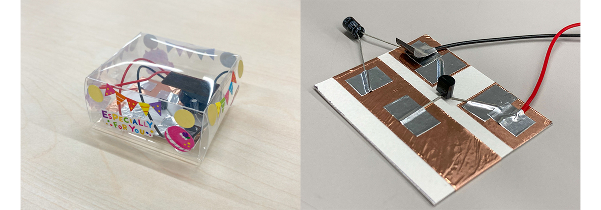 園児から小学生向けの教材です。本物の電子部品を使いながらも、はさみとテープだけで工作ができ、太陽光エネルギーを電力に変換し、メロディICで音楽を鳴らす電子機器の仕組みを体験できます。