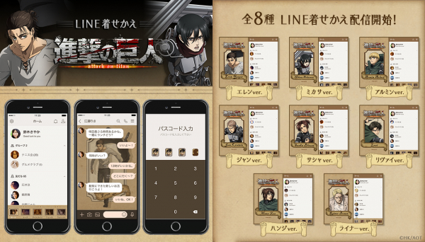 先行で配信されているThe Final Season のキービジュアルを使用したLINE着せかえに引き続き、主人公の「エレン」や幼馴染の「ミカサ」に加え、「リヴァイ」や「ライナー」の魅力的なキャラクターごとのLINE着せかえが一斉に新登場です。それぞれ世界観に合わせたデザインが特徴となっております。是非、好みのキャラクターや気分に合わせて着せかえをお楽しみ下さい。