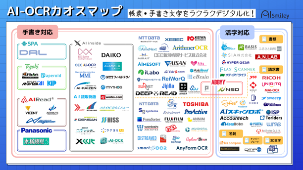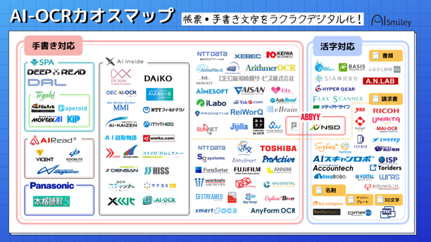 ※このカオスマップはAI-OCRを提供している企業のプレスリリースや製品サイト、導入実績などの公開情報を基にAIsmiley編集部が独自の主点で取りまとめたもので、網羅性や正確性を完全に担保するものではありません。