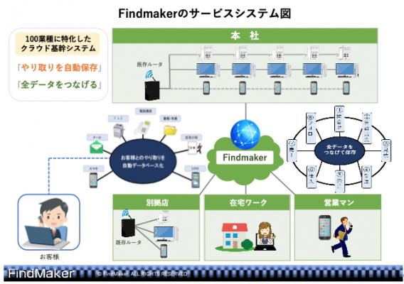 Findmakerは特定の業種に特化したクラウド型の業務管理システムです(現在9業種対応)。社内で管理されているあらゆる業務情報(見積、受注、発注、売上、仕入等)及び顧客接点記録(電話、FAX、メール、スマホ、LINE等)それぞれの【データをつなげる】ことによる業務効率化を強力に推進します。既に大手企業への導入実績もあることから、市場より高い評価を得ています。