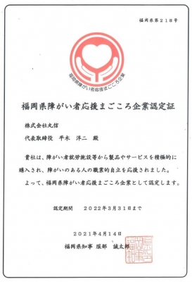 株式会社丸信(本社:福岡県久留米市/代表取締役社長:平木洋二)は4月14日、福岡県より「福岡県障がい者応援まごころ企業」の認定を受けましたのでお知らせいたします。