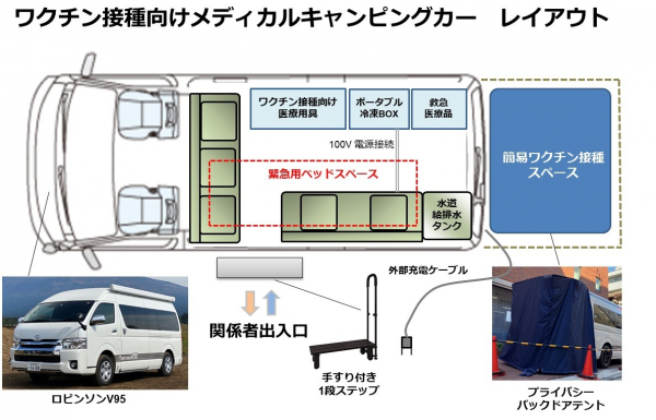 日本最大級のキャンピングカーのレンタル事業「ジャパンキャンピングカーレンタルセンター(Japan C.R.C.)」を運営するキャンピングカー株式会社(本社:東京都渋谷区、代表取締役社長:頼定 誠)は、2021年4月21日より、シミックソリューションズ株式会社(本社:東京都港区、代表取締役 社長執行役員 羽野 佳之)と共同で、キャンピングカーをベースとした移動型ワクチン接種カーの貸出を東京都23区内の自治体へ開始したことをお知らせいたします。