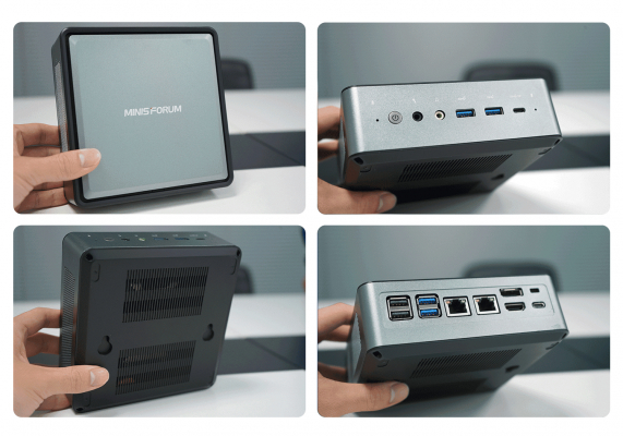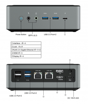増設スペースは 2.5 インチ SATA 3.0 HDD スロット x 2 (6.0Gb/s),M.2 2280 NVME SSD スロット x 1。インターフェイスはフロントがUSB3.0 port x4(Gen1)、有線LAN x2,音声出入力x1、またディスプレイ出力はHDMI 2.0x1(4K@60Hz), DisplayPortx1 (8K@60Hz)、USB-C Port(Thunderbolt 4, 8K&60Hz)で最大4Kの3画面、8Kの2画面表示が可能だ。