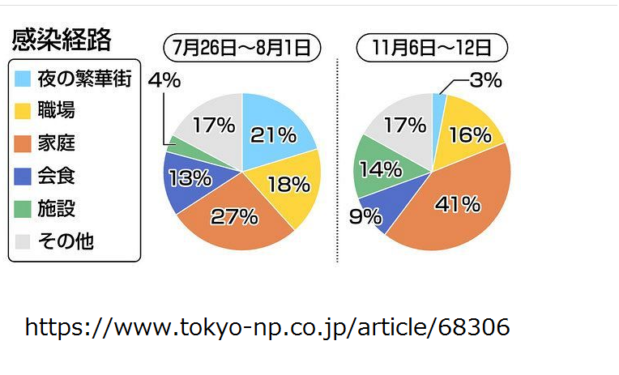 新型コロナの最大の感染源は家庭であり、二位が職場であり合わせて約60%近いです。