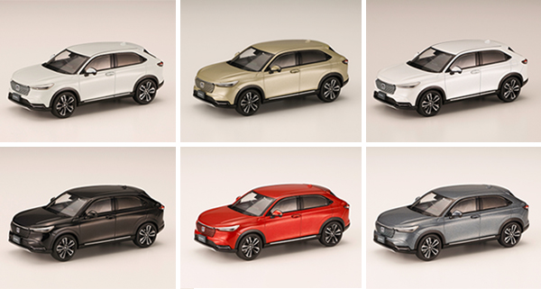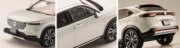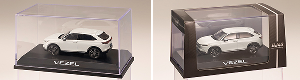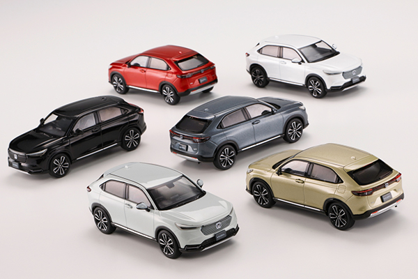 3代目フィットをベースにSUV、クーペ、ミニバンなどジャンルの枠を超えた多面的な価値を高次元で融合させた車種として開発され、2013年12月に登場し、2021年4月にフルモデルチェンジした「2代目 VEZEL」を1/43スケールダイキャストモデルとして発売します。モデル化に際し、実車コンセプトカーのモデリングに従事していた社内モデラーがスケールにマッチしたチューニングを行い、実車の雰囲気を再現する努力をしました。ボディーには亜鉛合金、タイヤはゴム系を使用し完全新規金型ダイキャストカーで再現します。ブレーキキャリパーやタイヤの溝に至るまで再現しました。ディスプレイに適したクリアケースとディスプレイベースが付属しコレクションに適しています。