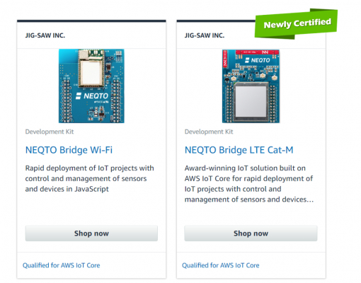 JIG-SAWの米国法人JIG-SAW US, INC.(米国サンフランシスコ、以下JIG-SAW US)は、本日、同社のエンタープライズ・レベルIoT「NEQTO Bridge LTE Cat-M Module」がAWS(Amazon.com, Inc. / NASDAQ: AMZN、Amazon Web Services, Inc.)のデバイス認定プログラム(DQP)認定を取得したと発表しました。