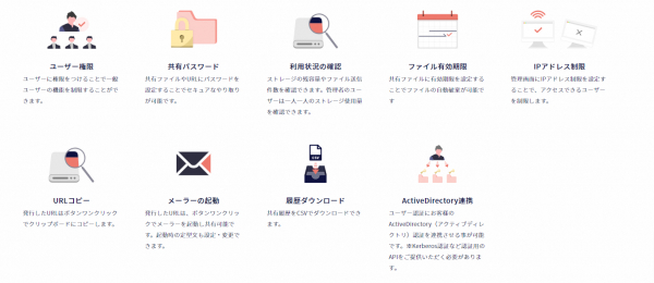 パスワード設定やIPアドレス制限など、安心して運用するための機能が豊富に備わっています。メールの添付ファイルが禁止されている場合やファイル共有の外部サービスではセキュリティが心配な場合でも、セキュアなやり取りが可能です。