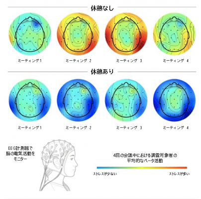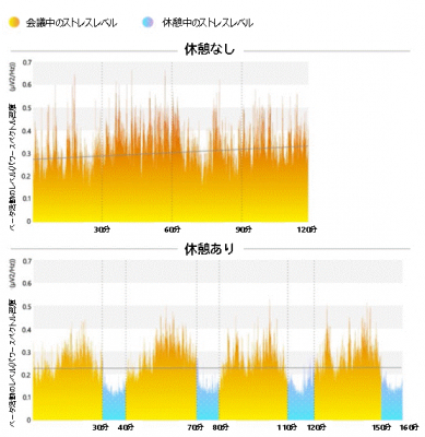 以前の調査 https://news.microsoft.com/ja-jp/2020/07/09/200709-future-work-good-challenging-unknown/ にもありましたが、2時間連続で会議することにより、ストレスに関連するベータ波の平均的な活動が徐々に高まり、ストレスが蓄積されます。しかし、瞑想して休む時間が与えられると、ベータ活動は低下し、「リセット」が可能になります。ビデオ会議の合間に休憩時間を入れることで、ストレスの蓄積を抑制できます。