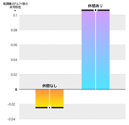 休憩時間に瞑想した参加者の脳波のパターンは、前頭葉のアルファ波の非対称性が高いレベルで出ていました。これは、会議中のエンゲージメントが高いことを示します。休憩をとっていない人は、前頭葉のアルファ波の非対称性がマイナスレベルで、会議中に離脱状態にあることや、エンゲージメントが下がっていることを示しています。休憩はウェルビーイングに良いだけでなく、仕事で最高のパフォーマンスを出す力も高めるのです。