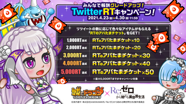 『Re:ゼロから始める異世界生活』とのコラボイベント復刻開催を記念して、「みんなで報酬グレードアップ!Twitter RTキャンペーン!」を実施いたします。『城とドラゴン』公式Twitterアカウント(@shirotodoragon)がつぶやいたキャンペーン対象ツイートの公式リツイート総数に応じて、いろいろなゲーム内アイテムが当たる「RTのアバたま」の専用チケット“RTのアバたまチケット”をユーザー全員にプレゼントいたします。