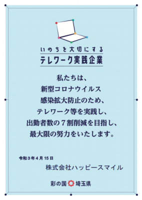 写真代行販売サービス「みんなのおもいで.com」を提供する株式会社ハッピースマイル(本社:埼玉県さいたま市西区 代表取締役社長兼CEO:佐藤堅一)は、埼玉県が新型コロナウイルス感染対策として推進している、「いのちを大切にする テレワーク実践企業」に2021年4月登録いたしました。