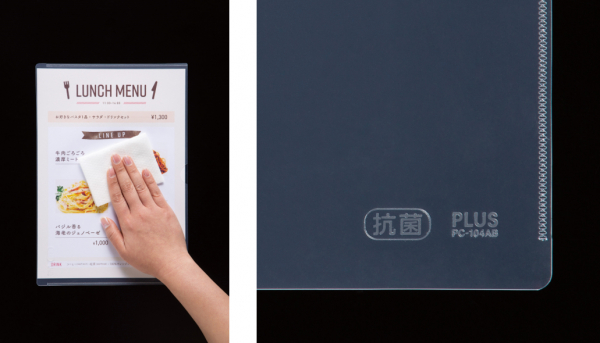 昨今、施設でのマスク着用やアルコール消毒、ソーシャルディスタンス確保のお願いなど、感染防止のための「掲示物」が増加しています。そういった掲示物やお店のメニュー表など、不特定多数の人との共有物に対する衛生面への配慮がますます高まる中、PPシートに抗菌剤を配合し、ケースの内側・外側ともに抗菌仕様のカードケースを開発しました。