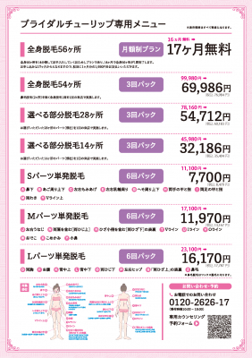 Bridalチューリップではこのたび、大手脱毛サロンと直接提携を叶えたことで、お客様がご利用しやすい価格帯を実現いたしました。全身脱毛だけではなく、パーツごとに施術可能なメニューを細分化することで、お客様が自分の状況に合わせた適切なプランを選択することができます。