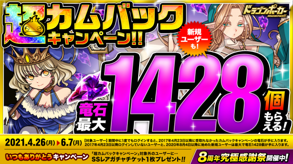 4月26日(月)より久しぶりにログインするユーザーや新規ユーザーを対象に、竜石が最大1428個もらえる「超カムバックキャンペーン」を開催いたします。