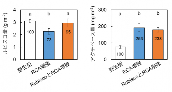 トウモロコシ由来のアクチベースをcabプロモーターで増強し、イネ由来のルビスコをrbcSプロモーターで増強した二重形質転換体を作出した。ルビスコ量が低下せず、アクチベース量のみが増強した二重形質転換体イネの作出に成功した。RCA: アクチベース、Rubisco: ルビスコ。